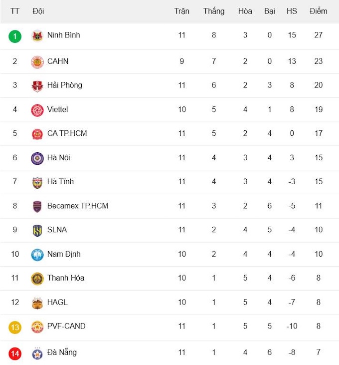 Sau vòng 11 của V.League 2025/26, Ninh Bình đang tạm dẫn đầu với 8 trận thắng, 3 hòa và được 27 điểm. Đây cũng là đội đang bất bại sau 11 trận đấu và vượt trội so với các đối thủ còn lại, nếu chỉ tính trong nhóm 4 đội dẫn đầu, gồm CAHN (26 điểm), Hải Phòng (20 điểm) và Thể Công Viettel (19 điểm). Trong lúc điểm số của các đối thủ ở những thứ hạng dưới còn cách xa hơn nữa, như CATP.HCM đứng thứ 5 với 17 điểm, còn Hà Nội và Hà Tĩnh xếp thứ 6 và 7 với 15 điểm, một khoảng cách khá lớn.