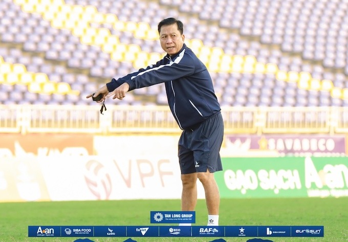 HLV Văn Sỹ Sơn chỉ đạo cầu thủ trong một buổi tập. Ảnh: FBNV |