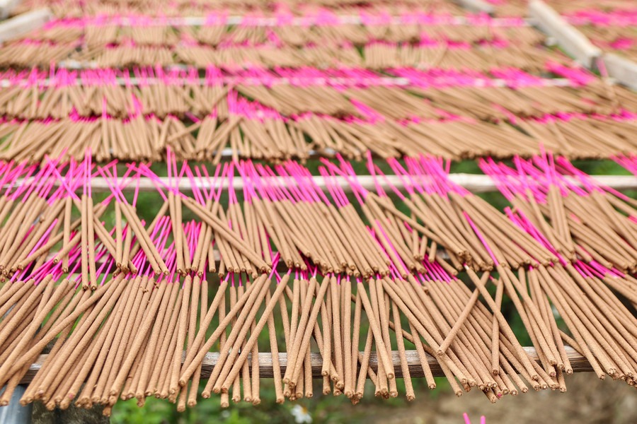 Mỗi dịp Tết đến Xuân về, khi đi ngang qua vùng đất xã Đông Lộc (Nghệ An), người ta dễ dàng bị níu chân bởi mùi hương trầm dịu nhẹ lan tỏa trong gió và sắc đỏ thắm của những bó hương phơi dọc đường làng.