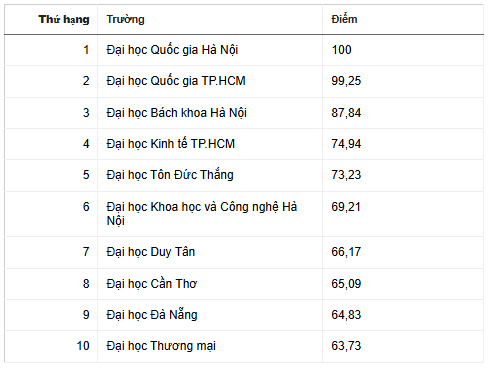 Mười trường đại học đạt số điểm đánh giá cao nhất gồm: