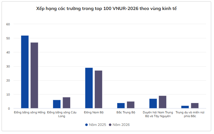 Xét riêng theo vùng kinh tế, các trường có thứ hạng cao vẫn tập trung chủ yếu ở Đồng bằng sông Hồng và Đông Nam Bộ, mặc dù số lượng trường của hai vùng này trong top 100 giảm nhẹ so với năm 2025.
