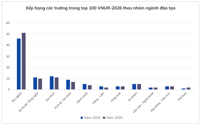 Xét theo nhóm ngành đào tạo, các trường đa ngành tiếp tục chiếm tỷ lệ áp đảo với 51 trường. So với 2025, một số nhóm ngành có xu hướng giảm nhẹ về số lượng trường trong top 100, bao gồm Kỹ thuật, Công nghệ (giảm từ 11 xuống 10), Sức khỏe (từ 12 xuống 11), Kinh tế, Tài chính (từ 9 xuống 7), Hành chính (từ 5 xuống 4) và Nông - Lâm (từ 3 xuống 2).