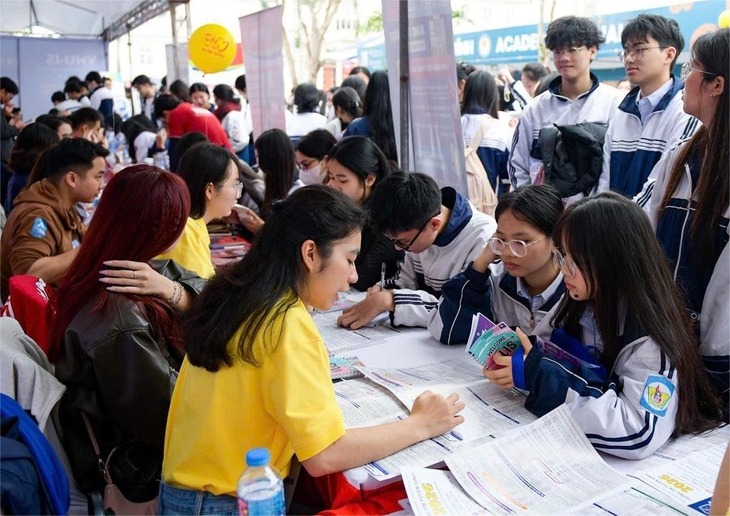 Học sinh tại Nghệ An nghe tư vấn cụ thể tại gian hàng của từng trường mà các bạn quan tâm, dự định đăng ký xét tuyển năm 2026 - Ảnh: NAM TRẦN |