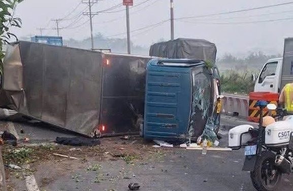 Tại hiện trường, chiếc xe tải nằm chắn gần như toàn bộ diện tích làn đường dành cho ô tô, hư hỏng nặng, phần thùng xe móp méo và kính chắn gió vỡ.
