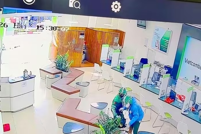 Thông tin ban đầu cho biết hai đối tượng nam giới mặc áo khoác kiểu giống tài xế hãng Grab, đội mũ bảo hiểm màu xanh, nghi sử dụng xe mô tô nhãn hiệu Exciter màu vàng – đen, biển kiểm soát 77G1-31xxx, mang theo một túi xách màu xanh (dạng ba lô cóc), dừng xe trước Phòng Giao dịch Trà Bá rồi đi vào khu vực quầy giao dịch.
