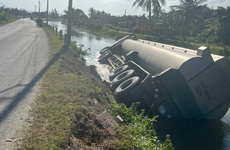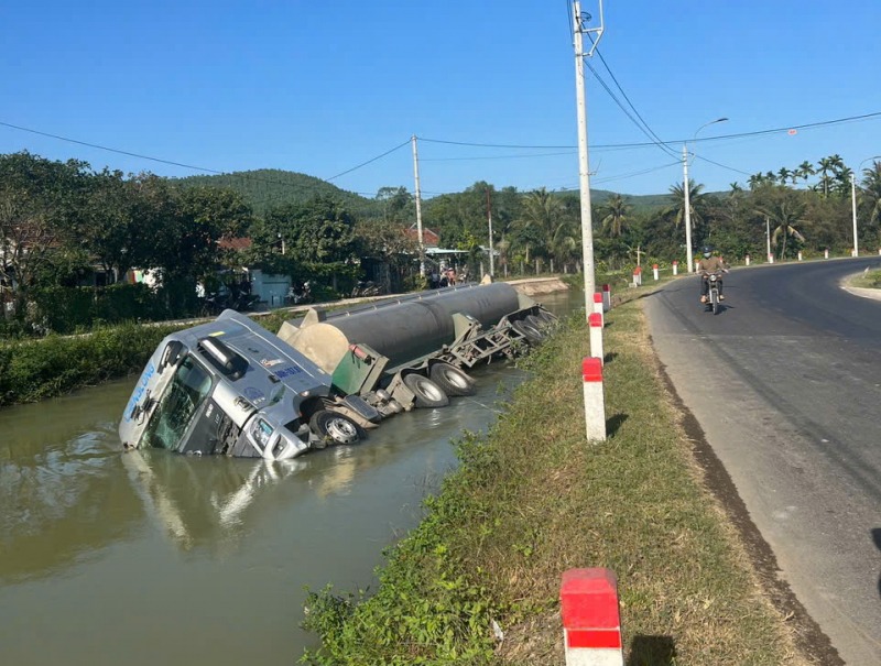 Xe bồn chở dầu lao xuống kênh do tài xế… ngủ gật