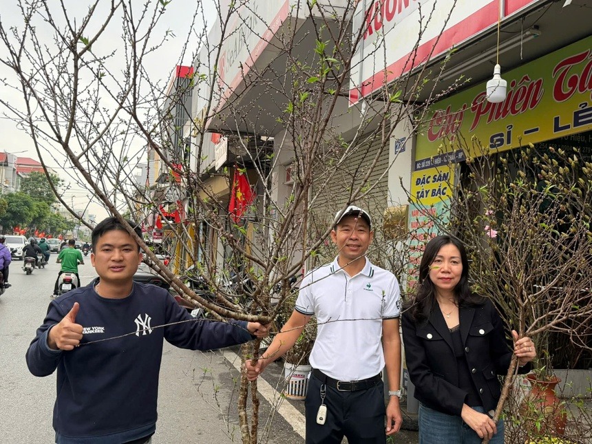 Vợ chồng bà Minh Thu gửi gắm không khí Tết cho U23 Việt Nam bằng cành hoa đào. |