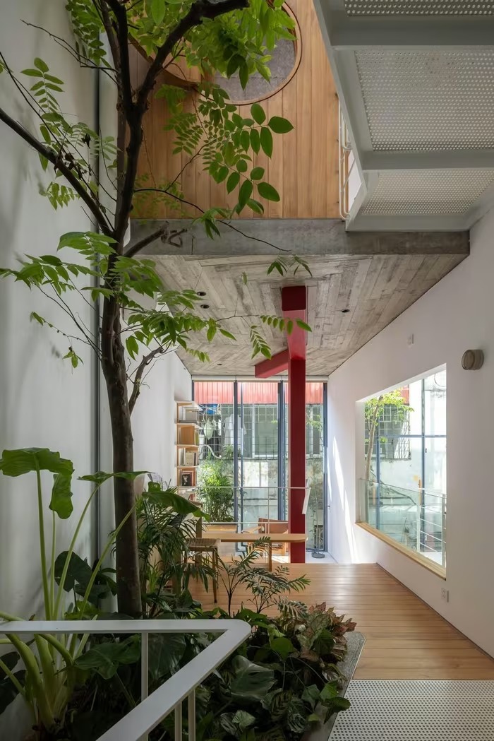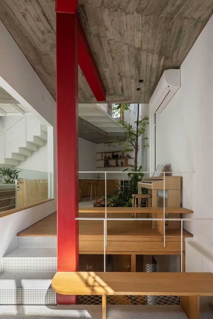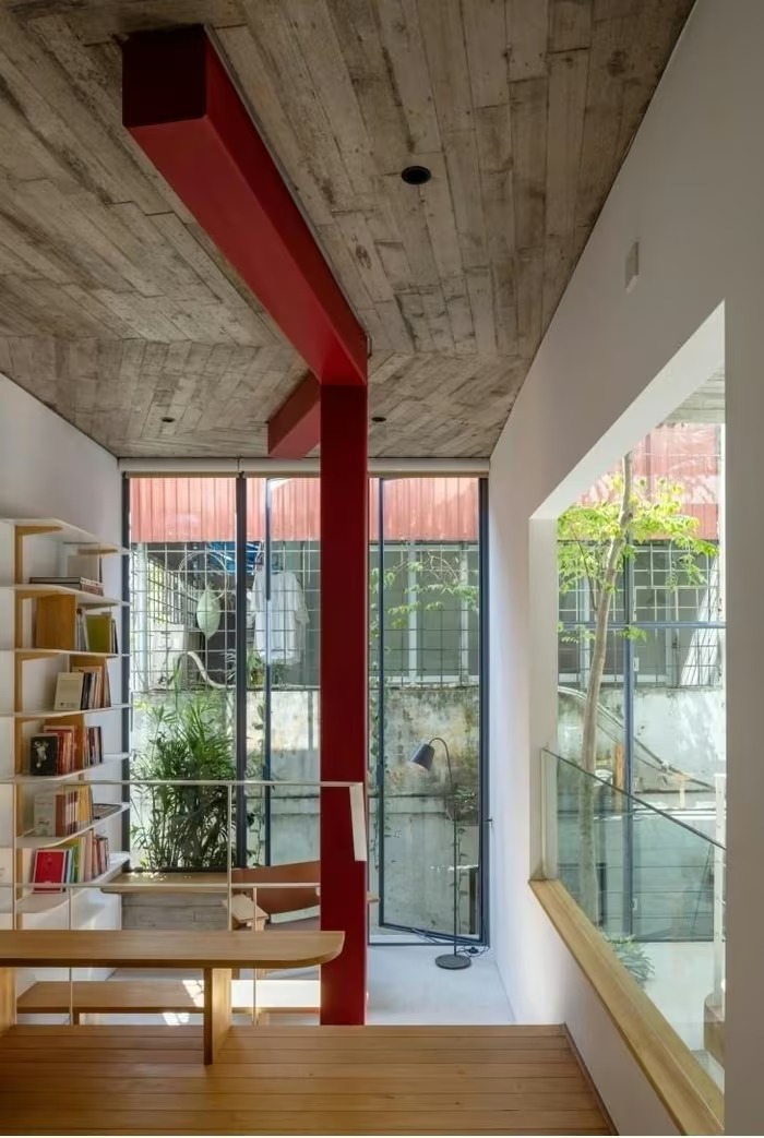 Những hạn chế về cấu trúc dẫn đến một hệ kết cấu được tổ chức xoay quanh một cột thép sơn đỏ đặt ở trung tâm, chạy xuyên suốt từ tầng một đến tầng bốn. Ảnh: Hoàng Lê |