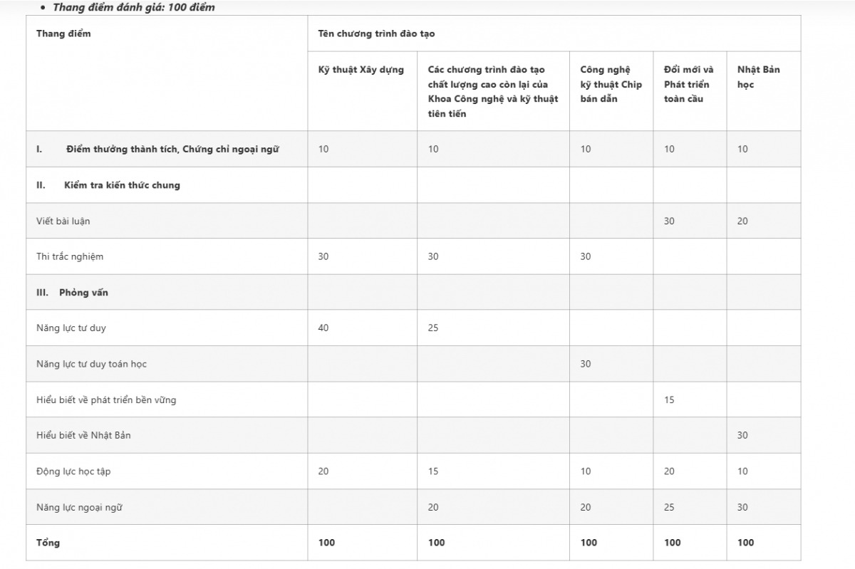 Thí sinh sẽ được tính điểm thành tích, chứng chỉ ngoại ngữ; tham gia phỏng vấn, viết bài luận hoặc thi trắc nghiệm, tùy từng chương trình. Tổng điểm đánh giá là 100.