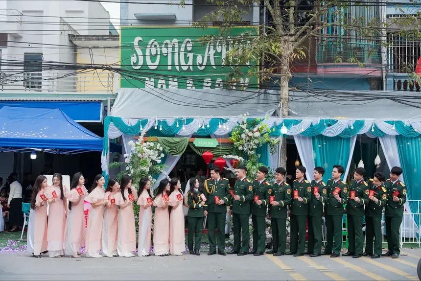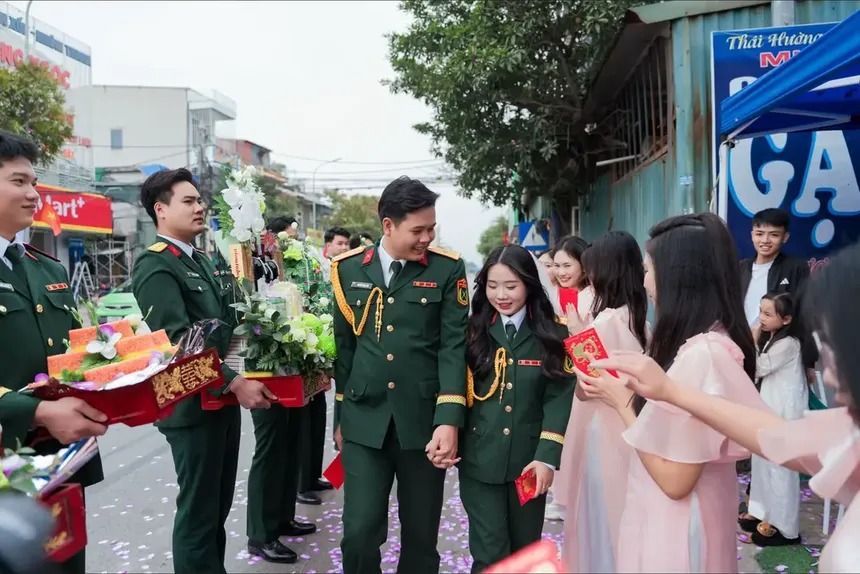Ngày 17/1, đám hỏi của cô dâu Phương Anh (quê Hưng Yên) và chú rể Đình Văn (quê Phú Thọ) diễn ra trong không khí ấm cúng tại quê nhà cô dâu. Bên cạnh niềm vui của hai nhân vật chính, buổi lễ còn thu hút sự chú ý đặc biệt từ cộng đồng mạng nhờ hình ảnh dàn bê tráp diện quân phục chỉnh tề, có ngoại hình sáng và đồng đều.
