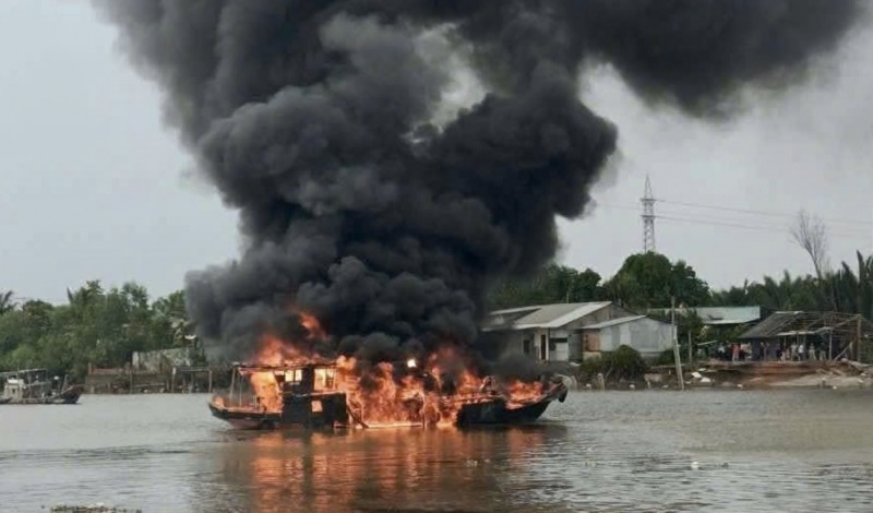 Sau tiếng nổ, chiếc ghe bốc cháy ngùn ngụt khiến 3 người bị thương. |