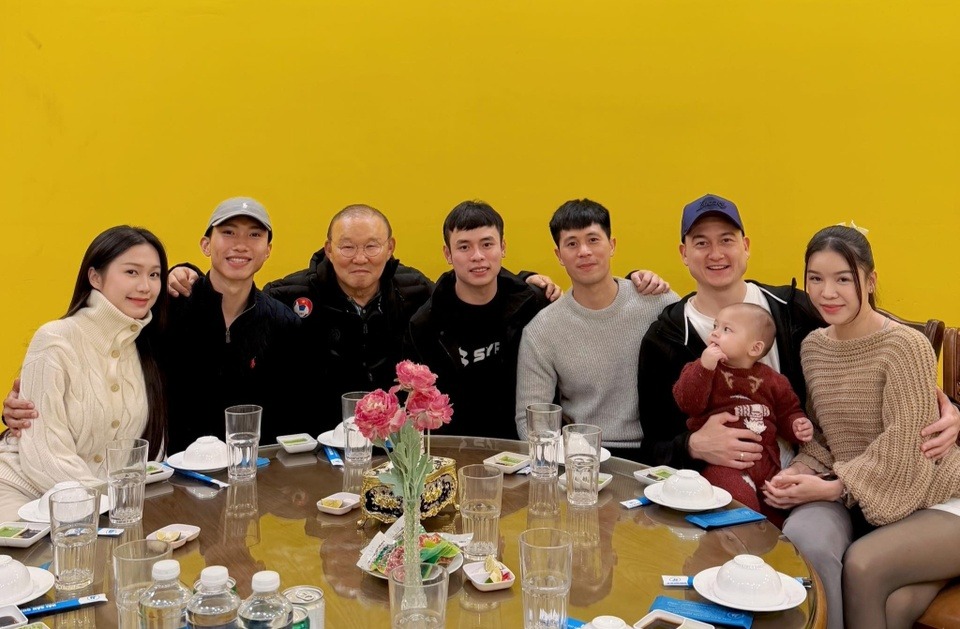 Bức ảnh ghi lại khoảnh khắc HLV Park Hang-seo hội ngộ các học trò cũ, với sự hiện diện của vợ chồng Đoàn Văn Hậu, vợ chồng Đặng Văn Lâm và Trần Đình Trọng.