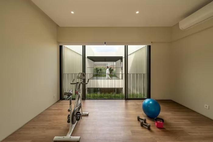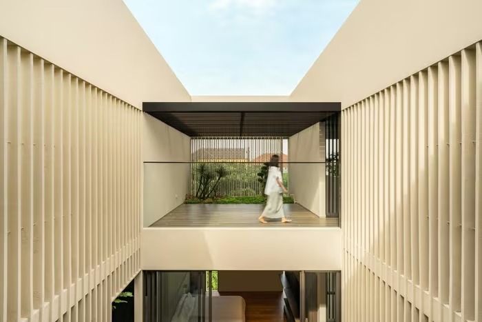 Kiến trúc được xác định bởi bố cục hai khối; hai khối nhà đặt dọc theo các cạnh bên của khu đất, tách biệt khỏi ranh giới để tạo điều kiện thông gió chéo và ánh sáng tự nhiên. Ảnh: Arte Haus |
