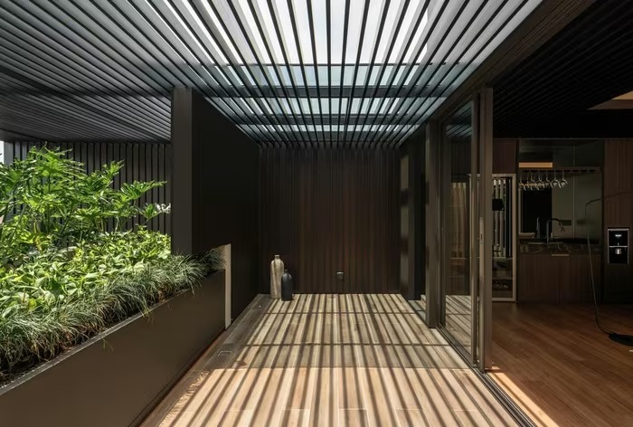 Do diện tích hạn chế, cây xanh được tích hợp dưới dạng bồn cây nhô ra ở mép trước của hồ bơi, không chỉ đóng vai trò như một lớp chắn thị giác và cách nhiệt với khu vực lân cận, mà còn là mái che cho khu vực để xe bên dưới. Ảnh: Arte Haus |