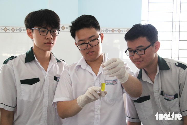 Gia Bảo học tập, thực hành thí nghiệm hóa học cùng các bạn trong lớp - Ảnh: ĐỨC CƯỜNG |