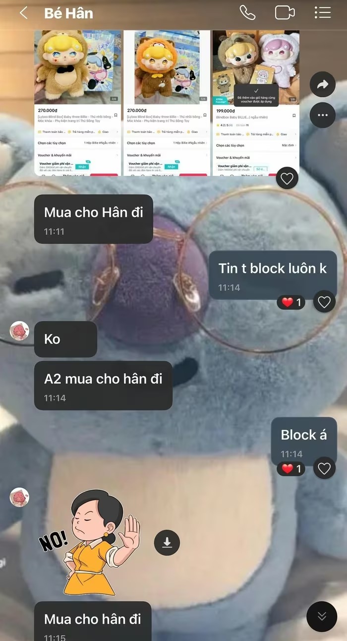 Thậm chí, khi bị anh trai "dọa" sẽ chặn (block) vì đòi hỏi quá nhiều, cô bé vẫn thản nhiên đáp lại: "Không, anh hai mua cho Hân đi" kèm theo những sticker vô cùng lém lỉnh. |