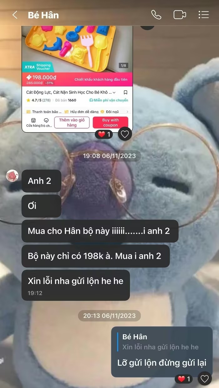 Từ những món đồ chơi như cát động lực, túi mù (blind box), cho đến chiếc bình giữ nhiệt khắc tên, cô bé luôn biết cách vòi vĩnh vô cùng đáng yêu: "Mua cho Hân đi mà". Đôi khi, cô bé cũng có cách nhờ vả anh mình các công việc như phơi đồ vừa hài hước vừa dễ thương khó có thể chối từ. |