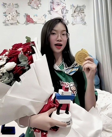 Lê Na chụp ảnh với huy chương SEA Games của Văn Bình. |