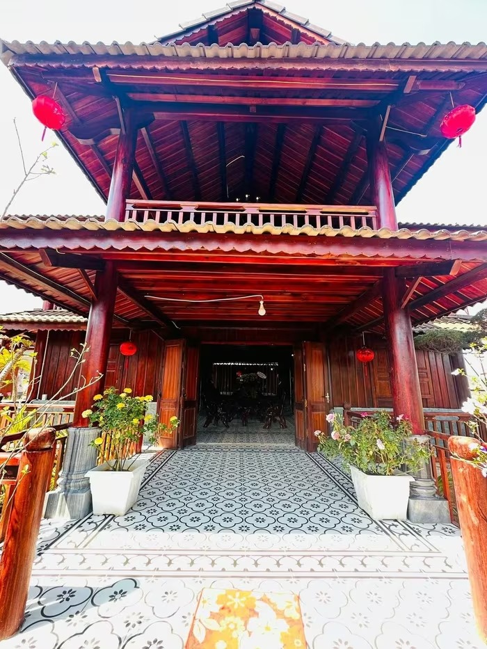 Tổng thể công trình có mái ngói, cột gỗ lớn, tạo cảm giác bề thế, gần gũi thiên nhiên. Ảnh: FB Hoàng Minh Bùi |