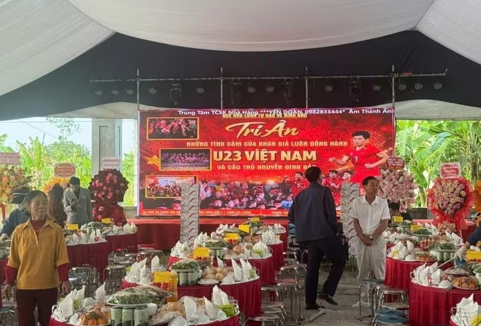 Khoảng 15h30 ngày 28/1, tại khu vực sân bóng đá ở xóm Hưng Yên Bắc 2 (xã Yên Trung, tỉnh Nghệ An), công tác tổ chức bữa tiệc ăn mừng của gia đình cầu thủ Đình Bắc đã gần hoàn tất, sẵn sàng đón khách. Một số người hâm mộ, bà con hàng xóm cũng đã bắt đầu tới tập trung.