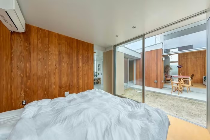 Phòng ngủ mở ra sân trong qua hệ cửa kính trượt. Ảnh: Studio ToLoLo |