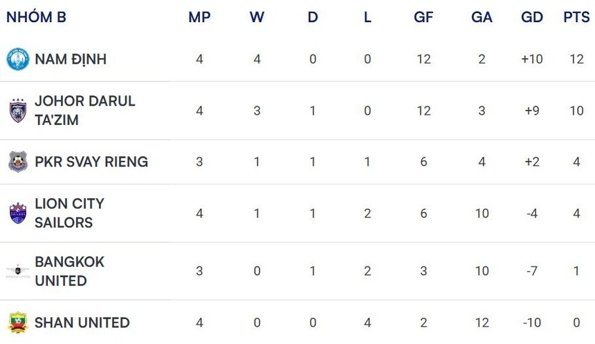 Sau 4 trận, Nam Định dẫn đầu với cách biệt 2 điểm so với Johor Darul Ta'zim. Trong khi đó, các đội bóng xếp dưới đều không còn cơ hội san bằng cách biệt với thầy trò HLV Mauro Jeronimo.