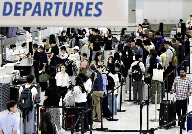 Du khách xếp hàng chờ làm thủ tục tại sân bay Narita, tỉnh Chiba, Nhật Bản, tháng 10/2025. Ảnh: The Yomiuri Shimbun. |