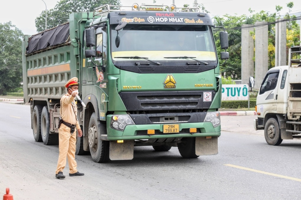 Cảnh sát giao thông dừng một xe có dấu hiệu quá tải trên đường Hồ Chí Minh. Ảnh: Gia Chính |