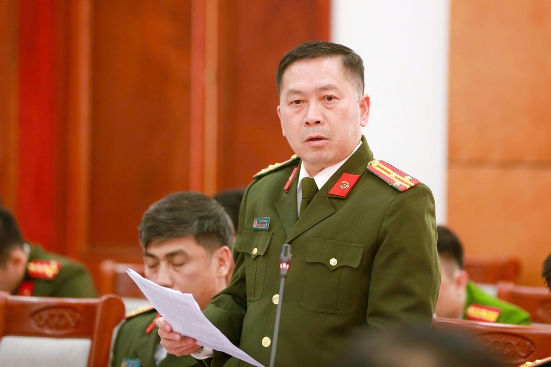 Đồng chí Thượng tá Phạm Thành Long, Phó Giám đốc Công an tỉnh phát biểu tại Hội nghị |