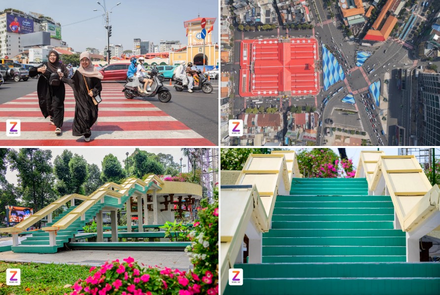 Đáng chú ý nhất là khu vực nút giao trước chợ Bến Thành, nơi mặt đường được vẽ lại với họa tiết sóng nước đan xen, cùng hồ Con Rùa "thay áo mới" bằng những dải màu xanh sáng.