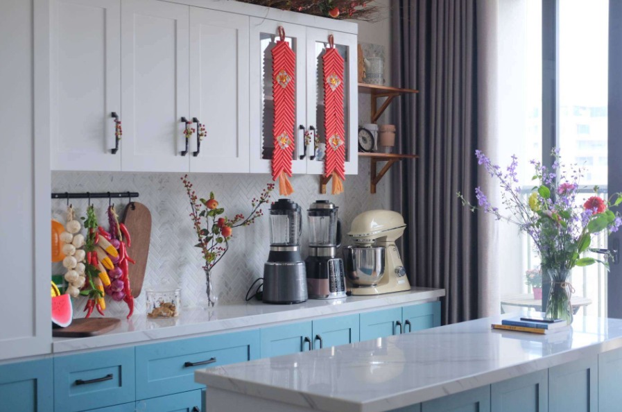 Khác với phòng khách hay khu vực trước nhà, bếp không cần trang trí quá nhiều. Sự tinh tế và vừa đủ mới là yếu tố quan trọng. Một lọ hoa tươi nhỏ, một cành đào, cành mai hoặc vài trái quất đặt gọn gàng trên kệ bếp vừa tạo điểm nhấn mùa xuân, vừa mang ý nghĩa tài lộc.