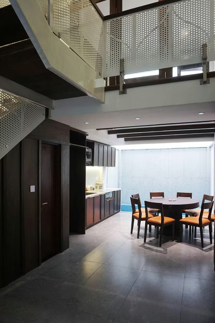 Lấy cảm hứng từ hình dáng lá dừa Nam Bộ, ngôi nhà tại TP HCM sử dụng 2 khoảng thông tầng lớn kết hợp với bể bơi nhỏ giúp tăng cường sự kết nối giữa con người và thiên nhiên. Ảnh: Lê Quang Bình |