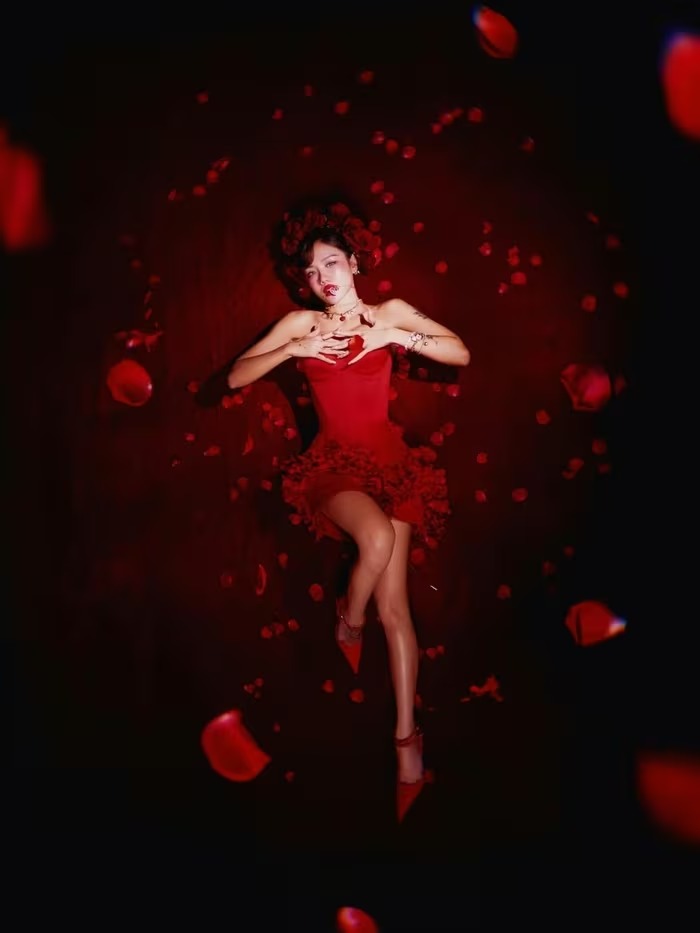 Nữ ca sĩ diện thiết kế váy quây bó sát với phần corset tôn vinh đường cong triệt để. Điểm nhấn là phần chân váy xòe rộng được kết từ hàng ngàn cánh hoa, tạo cảm giác như cô đang bước ra từ một đóa hồng nhung nở rộ. (Ảnh: IGNV) |