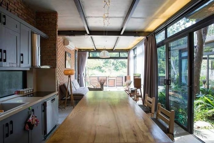 Khi cửa kính mở hoàn toàn, không gian trong nhà và khu vườn hòa thành một, cho gia chủ đắm mình hoàn toàn vào khí hậu núi và rừng. Ảnh: Tô Hữu Dũng |