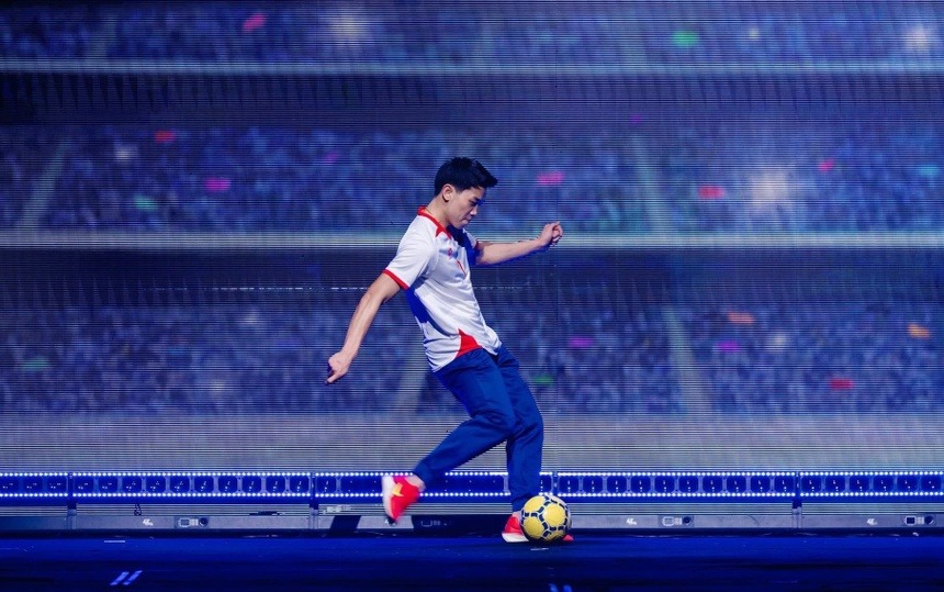 Trong đó, Đình Bắc nhảy theo nhạc nhưng tỏ ra lúng túng, ngượng ngùng vì chưa quen sân khấu giải trí. Không ít khoảnh khắc anh phải liếc nhanh sang dancer bên cạnh để "học lỏm" động tác. Có lúc động tác của nam cầu thủ chậm nhịp, có lúc tay chân chưa ăn khớp khiến người xem bật cười.