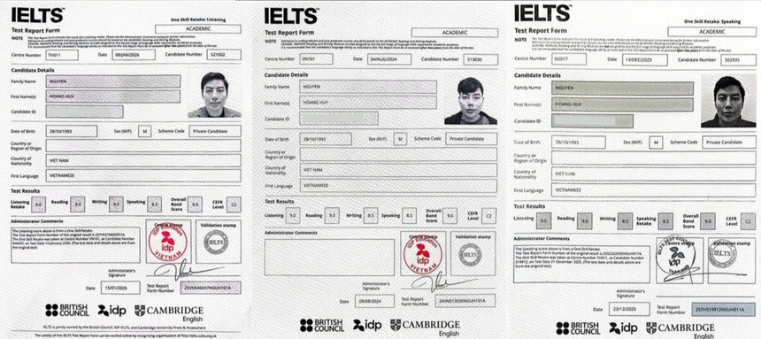 Ba lần Huy Forum đạt 9.0 IELTS được nam TikToker chia sẻ trên mạng xã hội. Ảnh: Nguyễn Hoàng Huy/Facebook. |