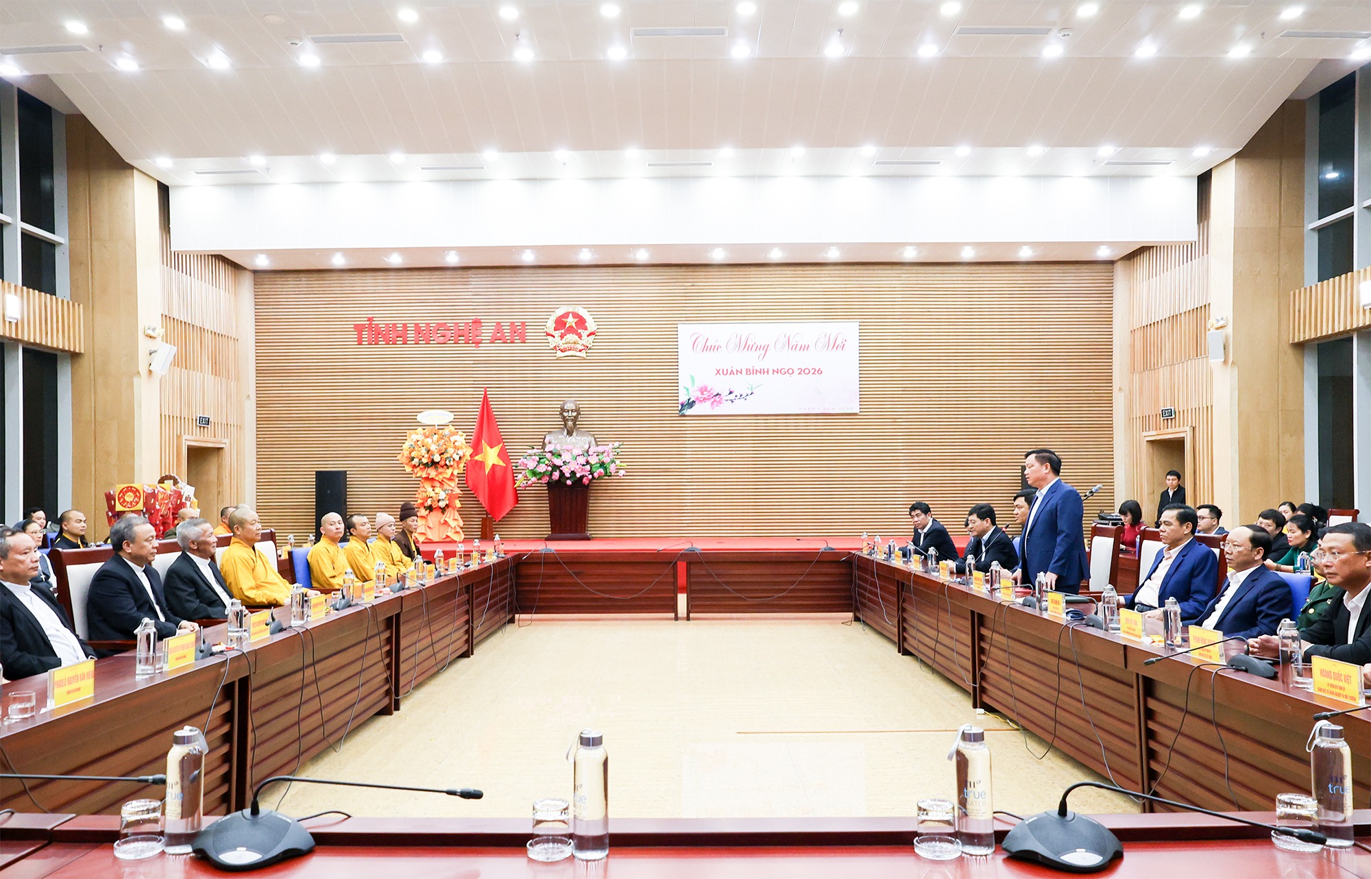 Lãnh đạo tỉnh cùng Tòa Giám mục Giáo phận Vinh, Ban Trị sự GHPGVN tỉnh chụp ảnh lưu niệm |