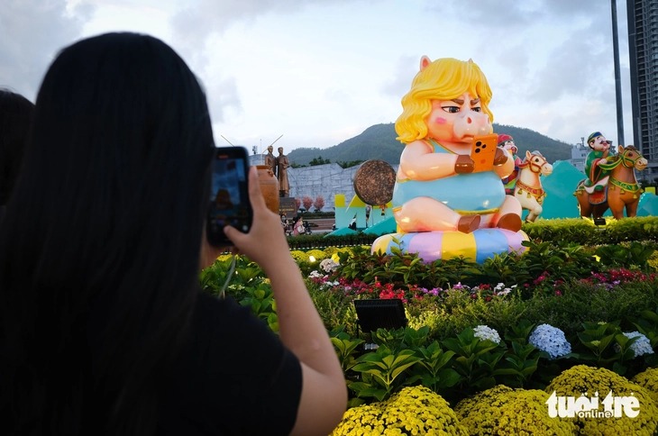 Người dân tham quan, ghi lại hình ảnh kỷ niệm bên cụm linh vật ngựa Tết - Ảnh: TẤN LỰC |