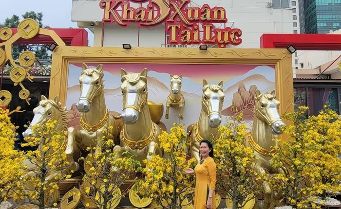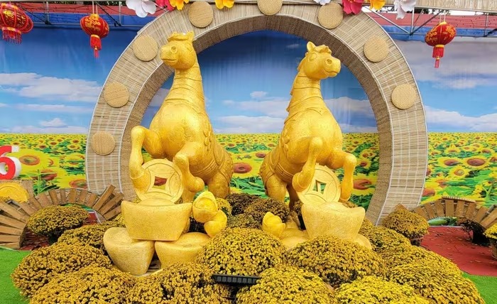 Trong khi đó, tại sân 4A, Nhà Văn hóa Thanh niên thành phố, người dân, du khách khá thích thú với hình ảnh linh vật ngựa "bay" ra từ đóa hoa mai vàng rực rỡ được treo trước cổng ra vào khu vực tổ chức lễ hội.