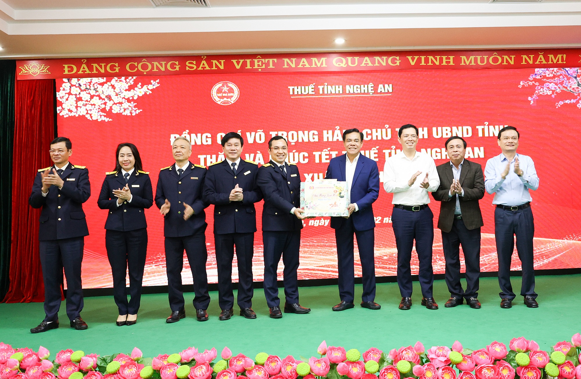 Thăm và chúc Tết cán bộ, công nhân viên ngành Thuế, Chủ tịch UBND tỉnh Võ Trọng Hải đã biểu dương những kết quả ấn tượng trong năm 2025 và giao chỉ tiêu về công tác thu thuế năm 2026. Năm 2025, một năm đầy biến động do thiên tai, bão lũ và quá trình kiện toàn bộ máy hành chính, tỉnh Nghệ An vẫn đạt được những thành tựu kinh tế - xã hội toàn diện. Tăng trưởng kinh tế đạt 8,41%, xếp thứ 13 cả nước. Thu ngân sách đạt con số ấn tượng 29.200 tỷ đồng, đứng thứ 17 trên tổng số các tỉnh, thành. Về an sinh xã hội, hoàn thành xóa nhà tạm, nhà dột nát cho 20.800 hộ gia đình; tỉnh đã huy động được 184 tỷ đồng dành cho người nghèo, người khó khăn, người yếu thế. Ngành giáo dục tiếp tục giữ vững vị thế dẫn đầu cả nước về học sinh giỏi quốc gia và quốc tế.… Có được những kết quả đó là nhờ sự đồng lòng, quyết tâm của cả hệ thống chính trị, Nhân dân, trong đó có sự đóng góp then chốt và nỗ lực vượt khó của ngành Thuế.
