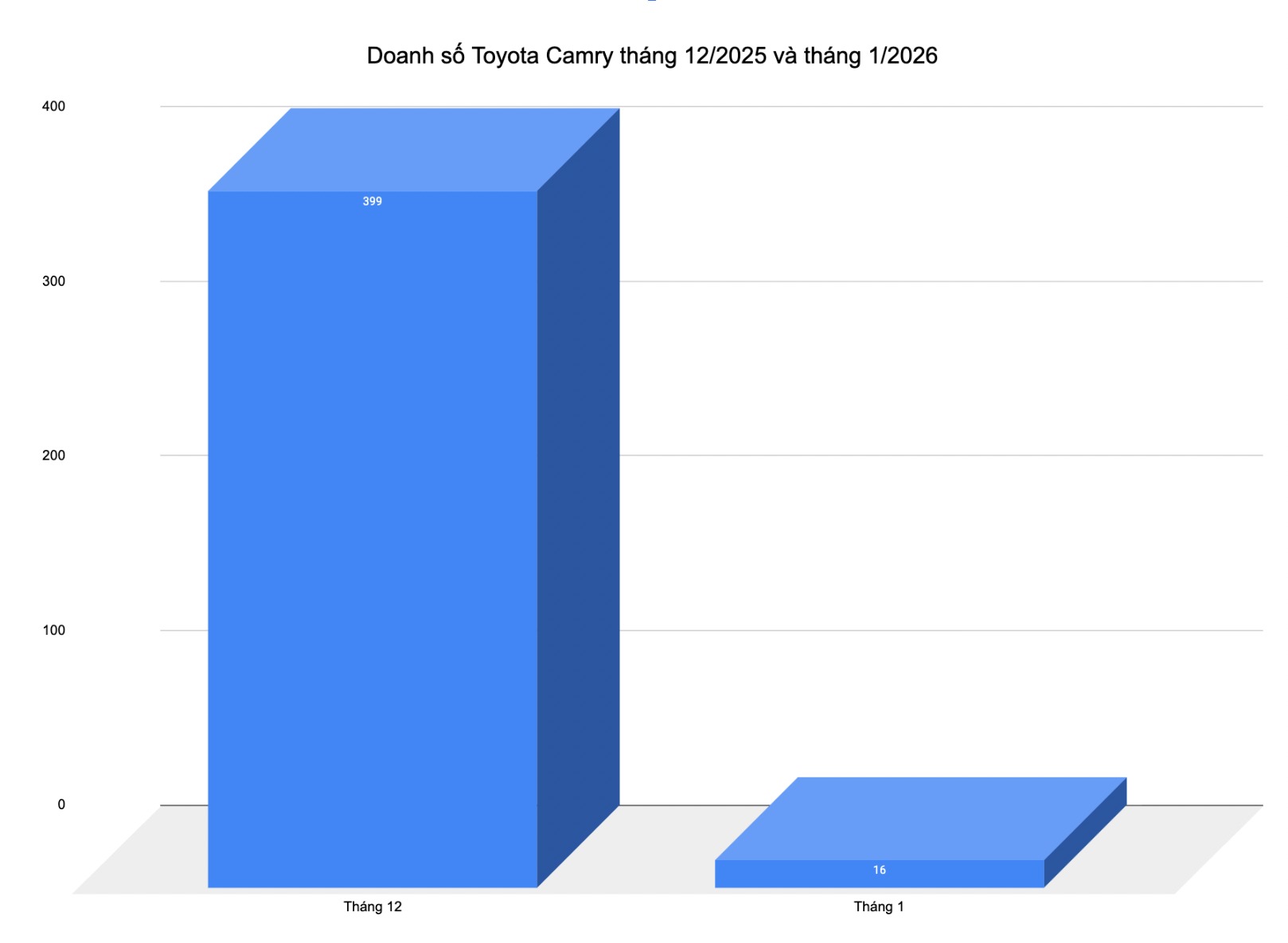 Theo số liệu bán hàng tháng 1/2026, Toyota Camry chỉ đạt 16 xe, giảm rất sâu so với mức 399 xe của tháng 12/2025. Đây là mức sụt giảm đáng kể nếu đặt trong tương quan tháng liền kề, đồng thời phản ánh bối cảnh chung của thị trường sau giai đoạn cao điểm mua sắm cuối năm.