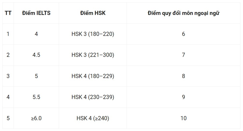 Bảng quy đổi chứng chỉ ngoại ngữ sang điểm xét tuyển năm 2026 như sau: