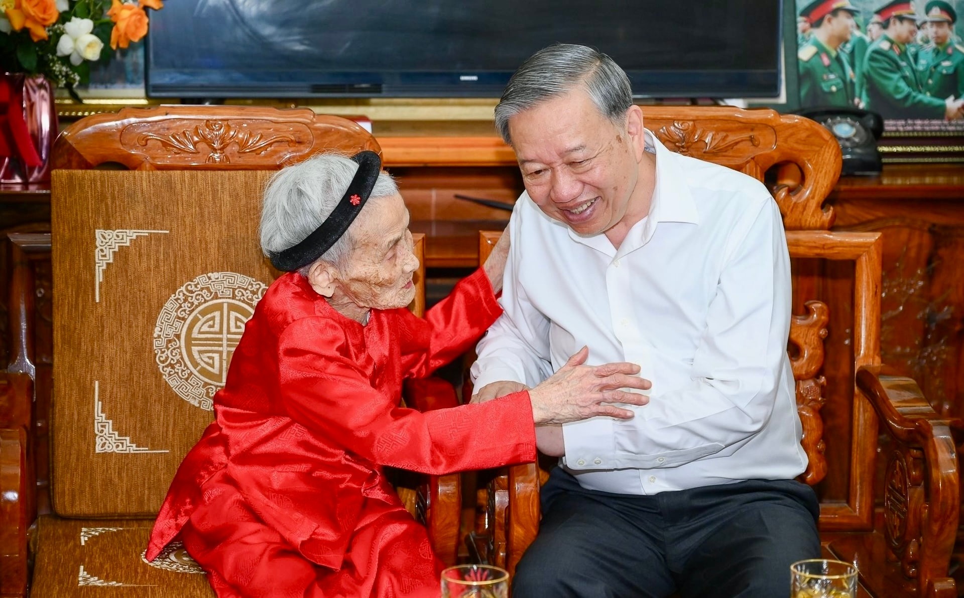 Tổng Bí thư Tô Lâm thăm, tặng quà Mẹ Việt Nam Anh hùng Lê Thị Sáu (Nghệ An). Ảnh: Thành Duy |