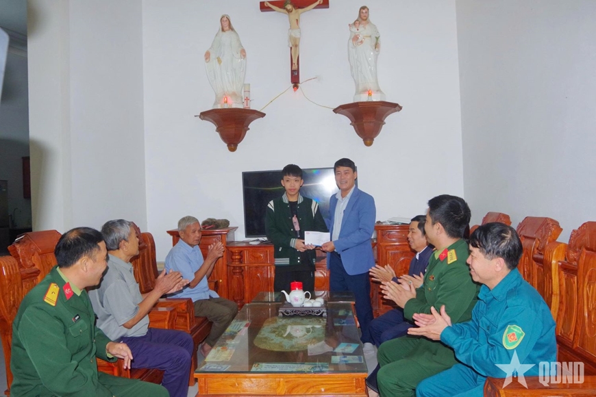 Lãnh đạo xã Quỳnh Phú tặng quà động viên thanh niên Bùi Đức Công chuẩn bị lên đường nhập ngũ. |