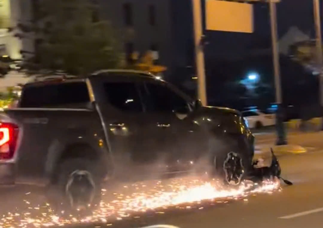 Hiện trường xe ô tô kéo lê xe máy. Ảnh cắt từ Clip |