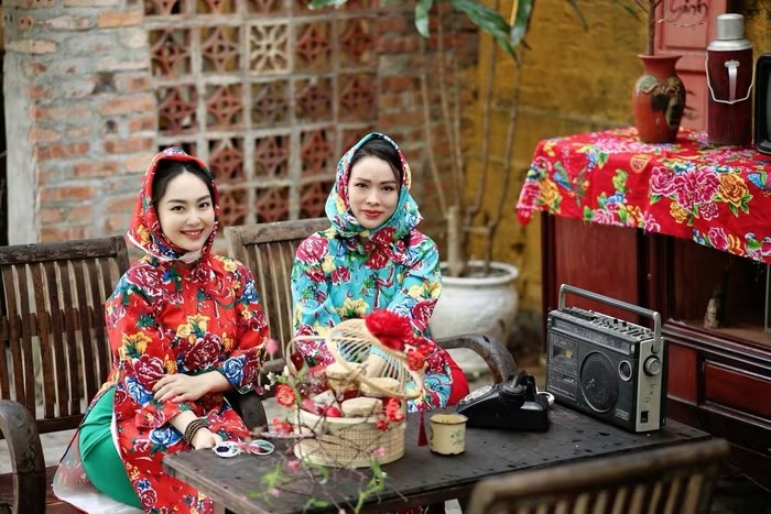 Bộ ảnh được thực hiện trong một không gian đậm chất xưa cũ với tivi đen trắng, điện thoại bàn quay số, phích nước Rạng Đông và những nhành đào xuân. Sự kết hợp này mang lại cảm giác ấm cúng, gợi nhắc về một cái Tết cổ truyền giản dị mà hạnh phúc. (Ảnh: FBNV) |