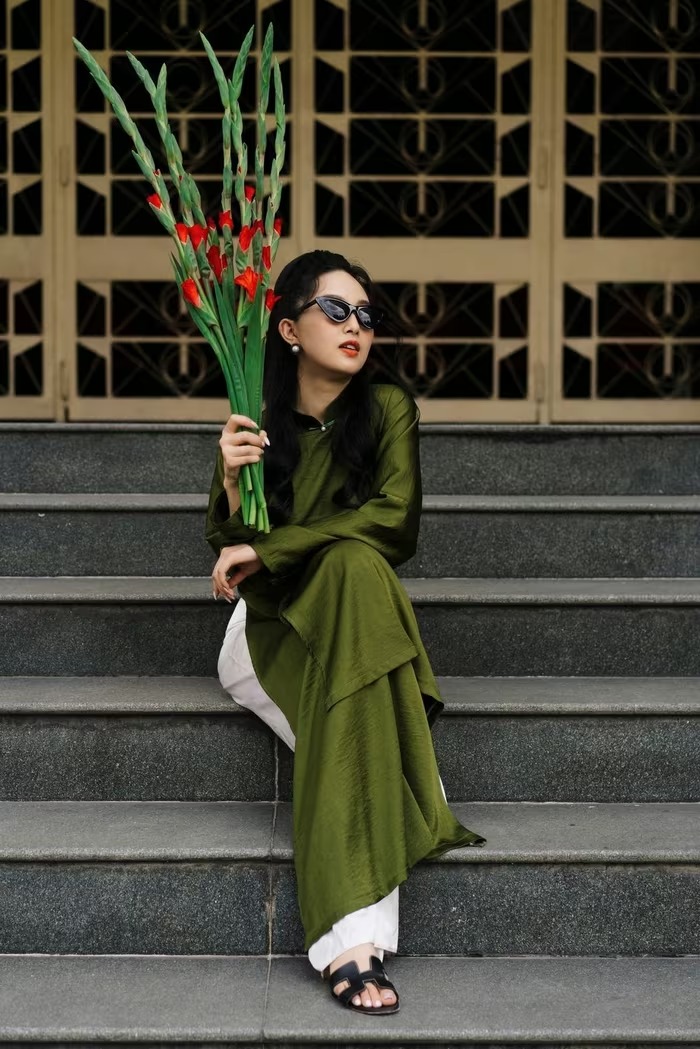 Cô khéo léo kết hợp cùng kính mát đen mắt mèo hiện đại, túi xách hiệu và bó hoa lay ơn - loại hoa "quốc dân" trong mỗi dịp Tết. Sự giao thoa giữa nét truyền thống của áo dài và sự thời thượng của phụ kiện tạo nên hình ảnh một "quý cô" năng động, tự tin trên phố phường. (Ảnh: FBNV) |