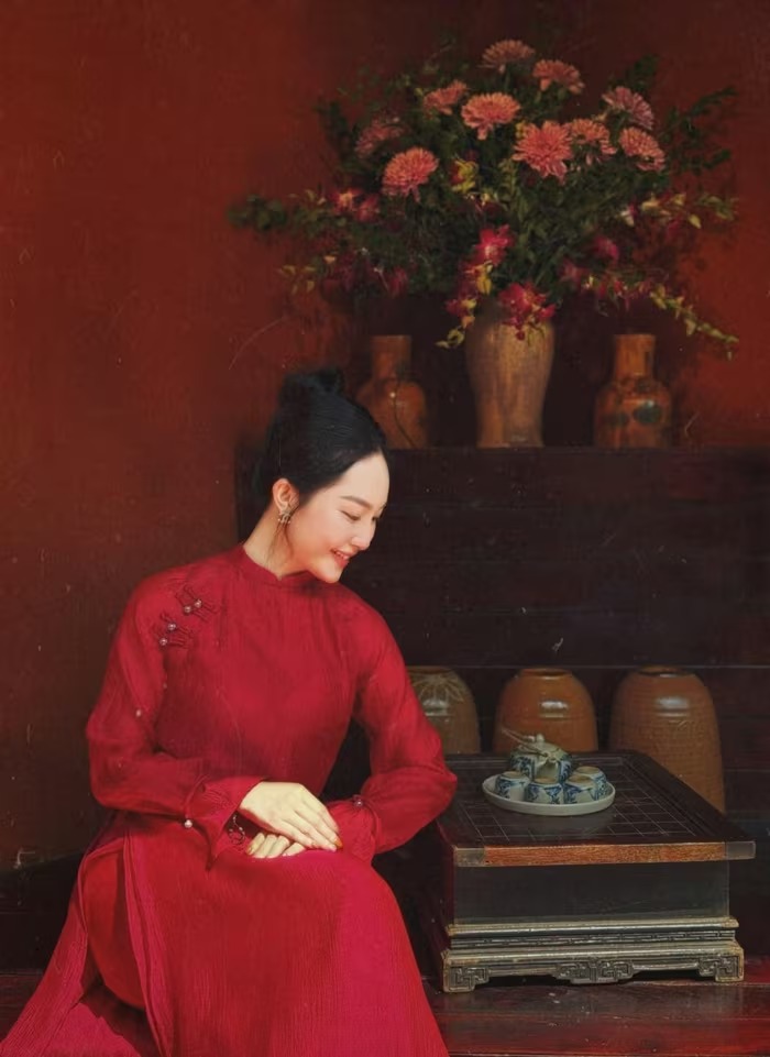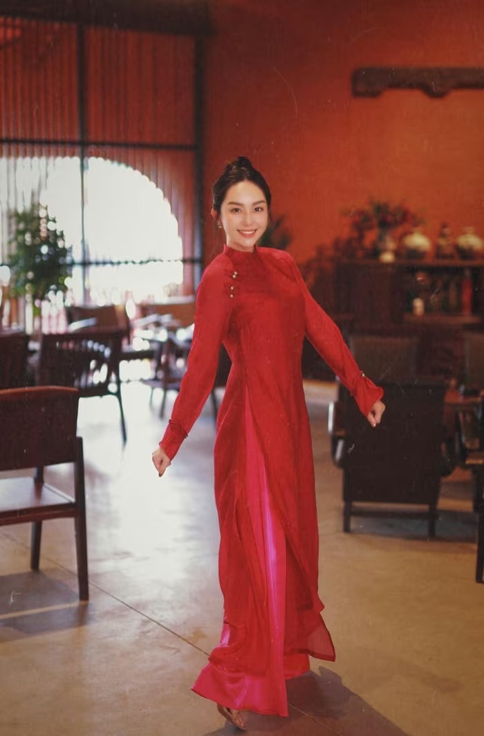 Trong một bộ ảnh khác, Trâm Anh lựa chọn thiết kế áo dài với sắc đỏ may mắn đầy nổi bật. (Ảnh: FBNV) |