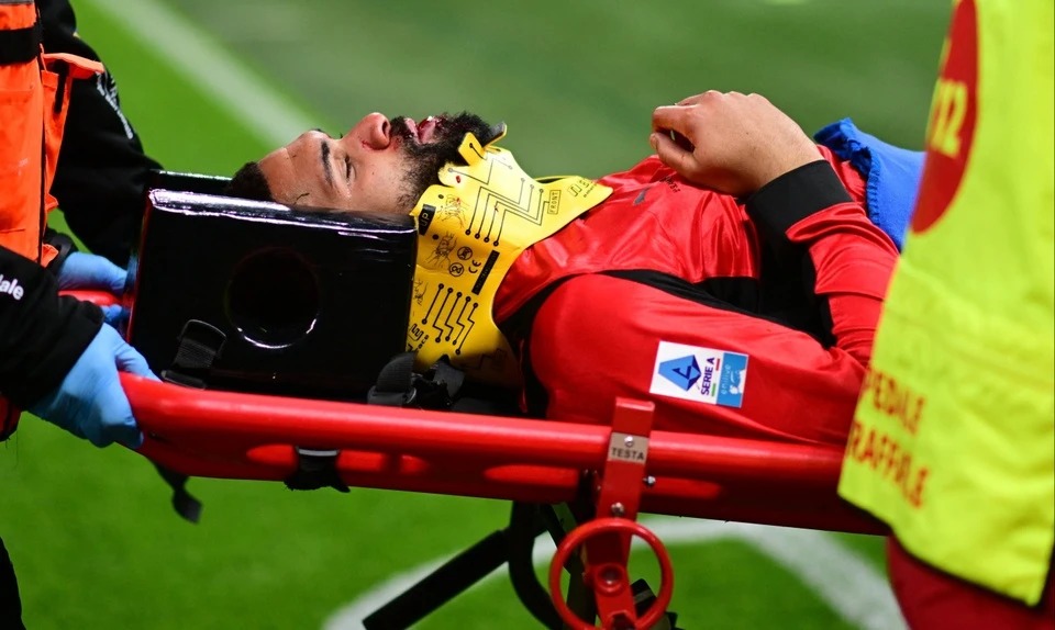 Đội ngũ y tế lập tức có mặt, tiến hành sơ cứu trước khi cố định cổ bằng nẹp bảo hộ và đưa cầu thủ rời sân bằng cáng trong sự lo lắng của khán giả.