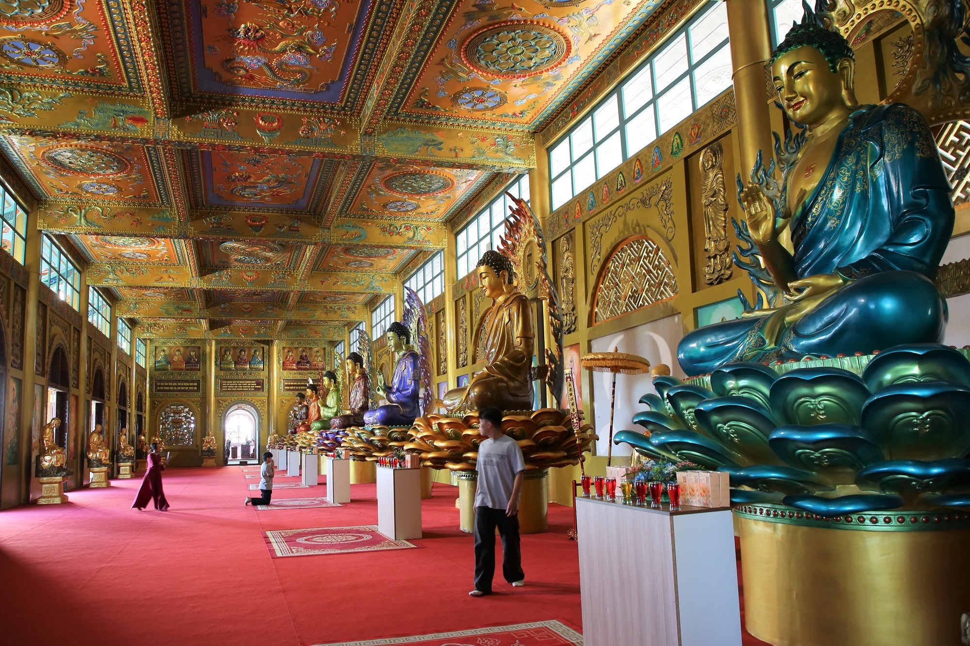 Ngoài ba pho tượng chính, bên trong Đại Hùng Bảo Điện còn tôn trí hàng chục tượng Phật kích thước lớn, tạo nên không gian thờ tự trang nghiêm. |